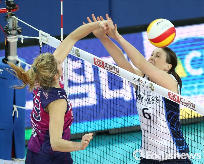(인천=포커스뉴스) 12일 인천 계양체육관에서 열린 '2015-2016NH농협 V-리그' 여자부 흥국생명-IBK기업은행 경기에서 흥국생명 테일러가 IBK기업은행 맥마흔의 블로킹에 앞서 연타로 볼을 너기고 있다.