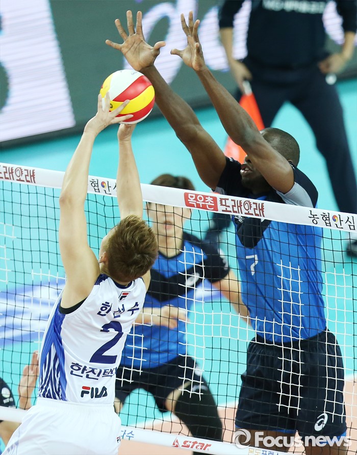 (인천=포커스뉴스) 12일 인천 계양체육관에서 열린 '2015-2016NH농협 V-리그' 남자부 대한항공-현대캐피탈 경기에서 대한항공 세터 한선수가 현대캐피탈 오레올의 블로킹을 앞에 두고 점프 토스하고 있다.