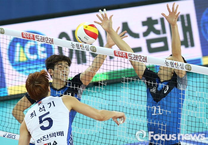 (인천=포커스뉴스) 12일 인천 계양체육관에서 열린 '2015-2016NH농협 V-리그' 남자부 대한항공-현대캐피탈 경기에서 대한항공 최석기가 현대캐피탈 최민호(11), 노재욱의 블로킹을 피해 스파이크를 때리고 있다.