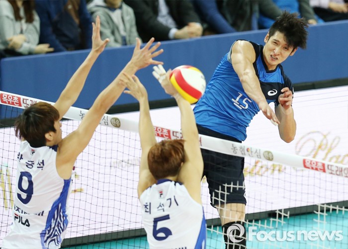 (인천=포커스뉴스) 12일 인천 계양체육관에서 열린 '2015-2016NH농협 V-리그' 남자부 대한항공-현대캐피탈 경기에서 현대캐피탈 문성민이 대한항공 곽승석, 최석기의 블로킹에 강스파이크를 때리고 있다.
