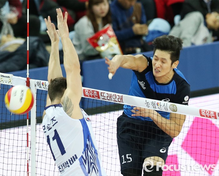 (인천=포커스뉴스) 12일 인천 계양체육관에서 열린 '2015-2016NH농협 V-리그' 남자부 대한항공-현대캐피탈 경기에서 현대캐피탈 문성민이 대한항공 모로즈의 블로킹을 뚫는 강스파이크를 때리고 있다.
