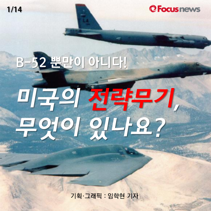 (서울=포커스뉴스) 지난 1월10일 미국의 B-52 폭격기가 한반도 상공을 120분 간 비행한 이후, 남북관계는 하루하루 살얼음판입니다. 북한은 "정세를 전쟁 접경에로 몰아가고 있다"며 강력히 비난하고 나섰고 한미 양국은 B-52 외의 다른 전략무기도 한반도에 배치할 것인지에 대해 협의 중이라고 하는데요. B-52 폭격기를 포함한 이른바 '전략무기'가 뭐길래 북한이 저토록 흥분하는지, 카드뉴스로 알아보시죠.