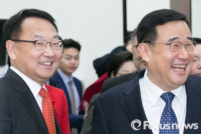 (서울=포커스뉴스) 취임식을 앞둔 유일호(왼쪽) 신임 경제부총리 겸 기획재정부 장관이 13일 오전 서울 여의도 국회 새누리당 대표최고위원실에서 김정훈(오른쪽) 정책위의장을 비롯한 여당 의원들과 인사하고 있다.