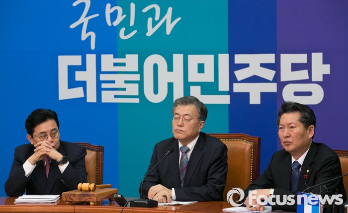 (서울=포커스뉴스) 문재인(가운데) 더불어민주당 대표와 전병헌(왼쪽), 정청래 최고위원이 13일 오전 서울 여의도 국회에서 열린 최고위원회의에 참석해 생각에 잠겨 있다.