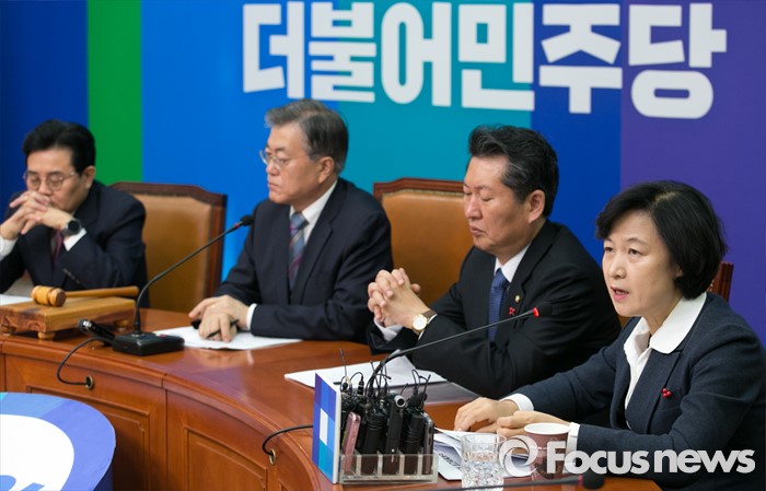한편 더민주 문재인 대표도 어제 권 고문의 탈당에 대해 "아프다. 어쨌든 호남민심이 반영된 것으로 겸허하게 받아들이고 새롭게 당을 만든다는 각오를 하겠다"고 말했다.13일 오전 서울 여의도 국회에서 열린 더불어민주당 최고위원회의에 참석한 추미애(오른쪽 첫번째) 최고위원이 권노갑 상임고문의 탈당 관련 발언하고 있다. 2016.01.13 박동욱 기자