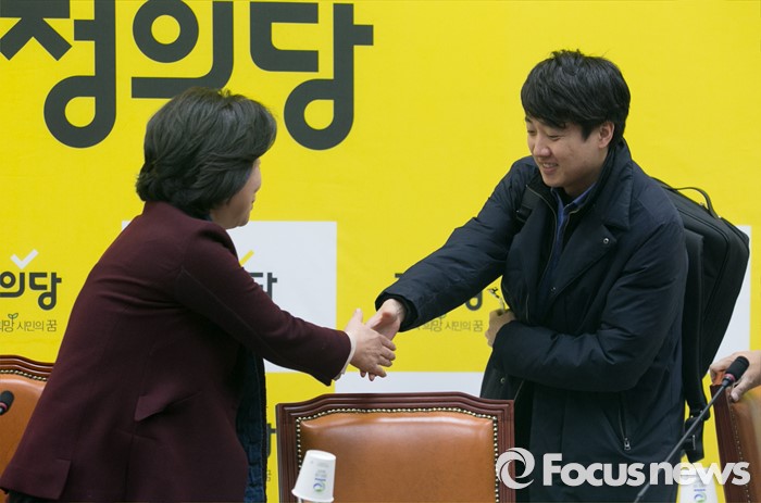 (서울=포커스뉴스) 13일 오전 서울 여의도 국회에서 열린 정의당 청년정당 비전발표회에 심상정(왼쪽) 상임대표와 이준석 새누리당 전 혁신위원장이 인사하고 있다.