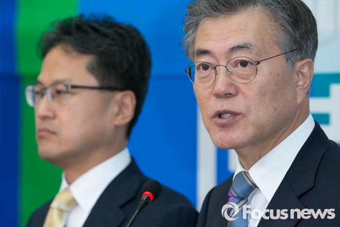 (서울=포커스뉴스) 문재인(오른쪽) 더불어민주당 대표가 13일 오전 서울 여의도 국회에서 재정부 국고국 과장 역임한 국가재정 전문가 김정우(왼쪽) 세종대 교수의 입당식에 참석해 인사말을 하고 있다. 김 교수의 부친은 김철배 더민주 강원도당 고문으로 12대 총선부터 15대 총선까지 5번(보선 1회 포함)을 철원, 화천, 양구 지역에서 범민주당의 이름으로 출마해, 5번 내리 낙선했다.