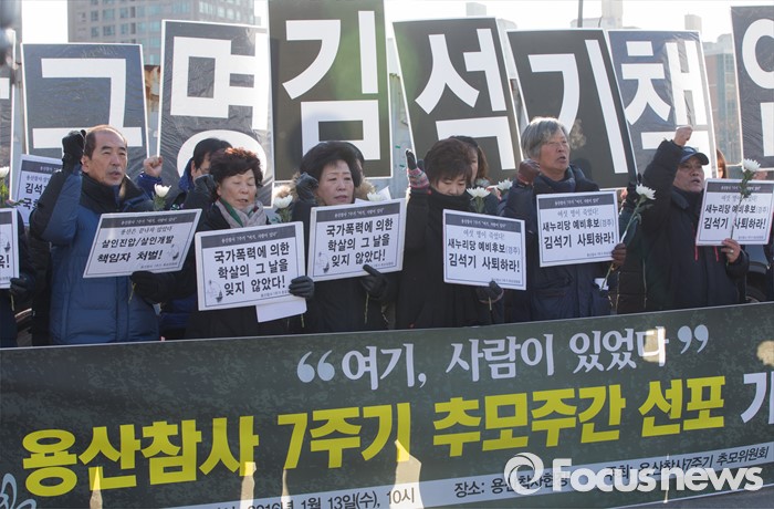 (서울=포커스뉴스) 13일 오전 서울 용산구 남일당 주차장에서 열린 '용산참사 7주기 추모주간 선포' 기자회견에 참석한 피해자 유가족들과 용산참사7주기 추모위원회원들이 진상규명과 책임을 요구하는 구호를 외치고 있다.