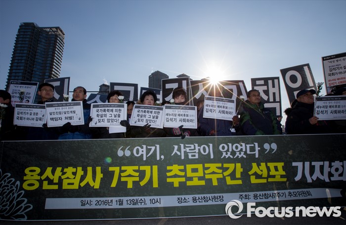 (서울=포커스뉴스) 13일 오전 서울 용산구 남일당 주차장에서 열린 '용산참사 7주기 추모주간 선포' 기자회견에 참석한 용산참사7주기 추모위원회원들이 진상규명과 책임을 요구하는 손팻말을 들고 있다.