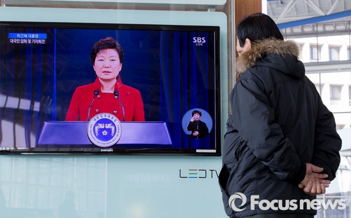 (서울=포커스뉴스) 13일 오전 서울역 대합실에서 시민들이 박근혜 대통령의 대국민 담화 및 기자회견을 시청하고 있다.