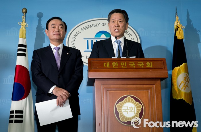 (서울=포커스뉴스) 13일 오전 서울 여의도 국회 정론관에서 장병완(왼쪽), 주승용 더불어민주당 의원이 탈당 기자회견을 하고 있다.