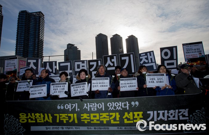 (서울=포커스뉴스) 13일 오전 서울 용산구 남일당 주차장에서 열린 '용산참사 7주기 추모주간 선포' 기자회견에 참석한 용산참사7주기 추모위원회원들이 진상규명과 책임을 요구하는 손팻말을 들고 있다.