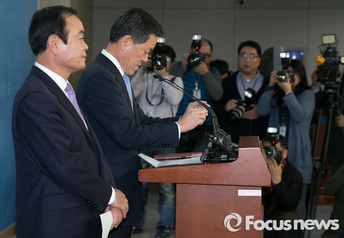 (서울=포커스뉴스) 13일 오전 서울 여의도 국회 정론관에서 장병완(왼쪽), 주승용 더불어민주당 의원이 탈당 기자회견을 하고 있다.