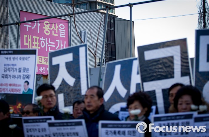 (서울=포커스뉴스) 13일 오전 서울 용산구 남일당 주차장에서 열린 '용산참사 7주기 추모주간 선포' 기자회견의 손팻말을 너머 모델하우스의 광고문구가 보이고 있다.
