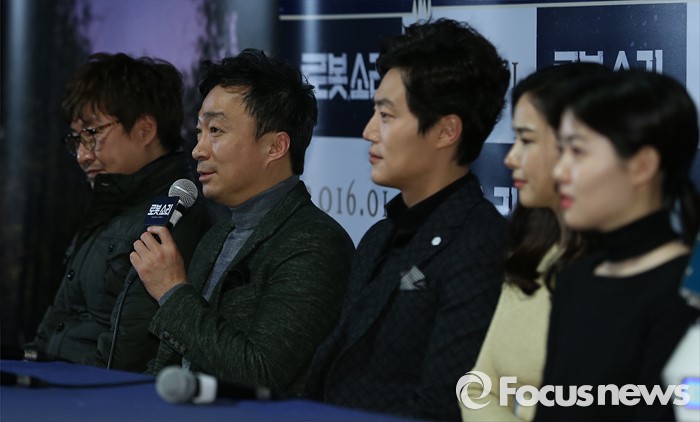 (서울=포커스뉴스) 13일 오후 서울 광진구 롯데시네마 건대입구점에서 열린 영화 '로봇, 소리' 언론시사회에 참석한 배우 이성민(왼쪽 두번째)이 인사말을 하고 있다. 왼쪽부터 영화감독 이호재, 배우 이성민, 이희준, 이하늬, 심은경.