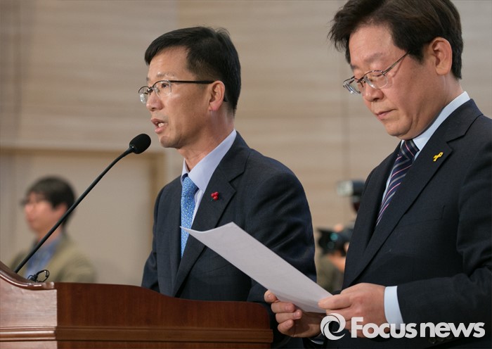 (서울=포커스뉴스) 유영록(왼쪽) 김포시장과 이재명 성남시장이 13일 오후 서울 여의도 국회 의원회관에서 더불어민주당 누리과정특위 주최로 열린 임박한 보육대란, 어떻게 해결할 것인가 긴급 현안토론회에 앞서 더민주당 소속 경기도 기초단체장 15명의 누리과정 지방비 투입 반대 성명서를 발표하고 있다.