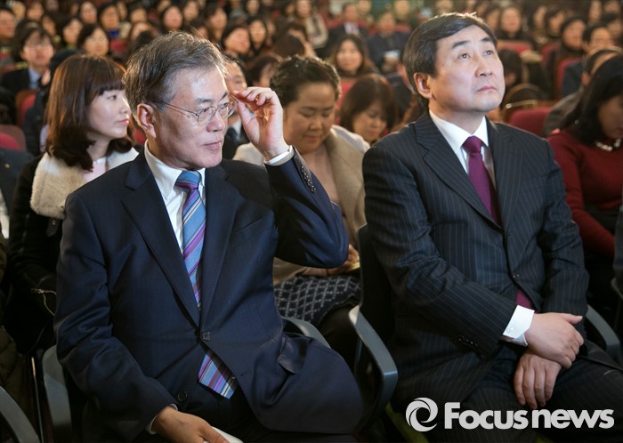 (서울=포커스뉴스) 13일 오후 서울 여의도 국회 의원회관에서 더불어민주당 누리과정특위 주최로 열린 임박한 보육대란, 어떻게 해결할 것인가 긴급 현안토론회에 참석한 문재인 대표가 안경을 만지고 있다. 오른쪽은 이종걸 원내대표.