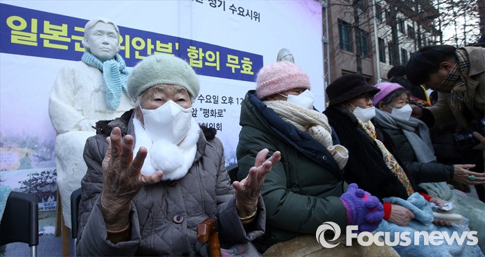 (서울=포커스뉴스) 13일 오후 서울 종로구 옛 일본대사관 앞에서 열린 제1213차 일본군 위안부 피해자 문제 해결 위한 정기 수요시위에서 할머니들이 시위에 참석 하고 있다.
