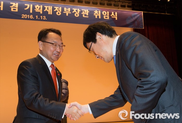(세종=포커스뉴스) 유일호 신임 경제부총리 겸 기획재정부장관이 13일 오후 세종시 정부세종청사 대강당에서 열린 취임식에 참석해 직원과 악수하고 있다.