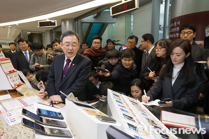 (서울=포커스뉴스) 13일 오후 서울 중구 중앙우체국 알뜰폰 판매창구를 찾은 최성준 방송통신위원장이 휴대폰을 살펴보고 있다.