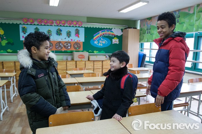 (서울=포커스뉴스) 초등학교 신입생 예비소집일인 13일 오후 서울 용산구 이태원초등학교에서 예비 초등학생 리차드 위키(왼쪽)가 새로 만난 친구와 인사를 나누고 있다.