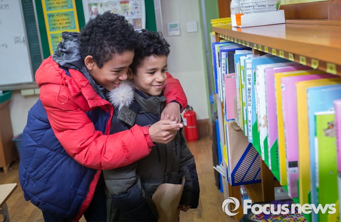 (서울=포커스뉴스) 13일 오후 서울 용산구 이태원초등학교에서 국내거주 외국인 부모를 둔 중학생 에드워드 위키가 초등학교 입학을 앞둔 동생 리차드 위키와 함께 교실을 둘러보고 있다.