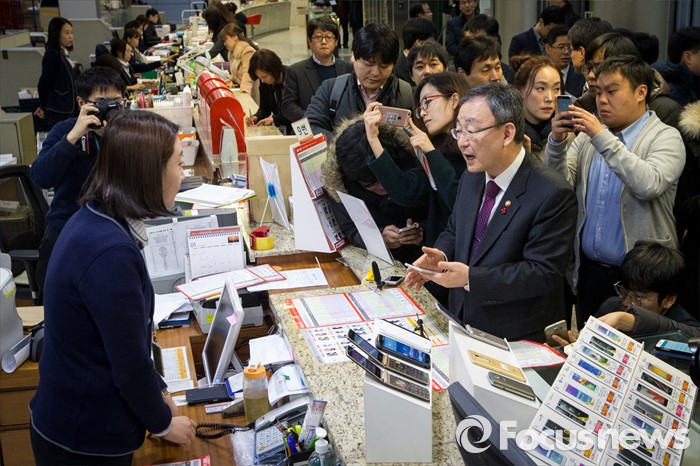 (서울=포커스뉴스) 13일 오후 서울 중구 중앙우체국 알뜰폰 판매창구를 찾은 최성준 방송통신위원장이 직원과 대화하고 있다.
