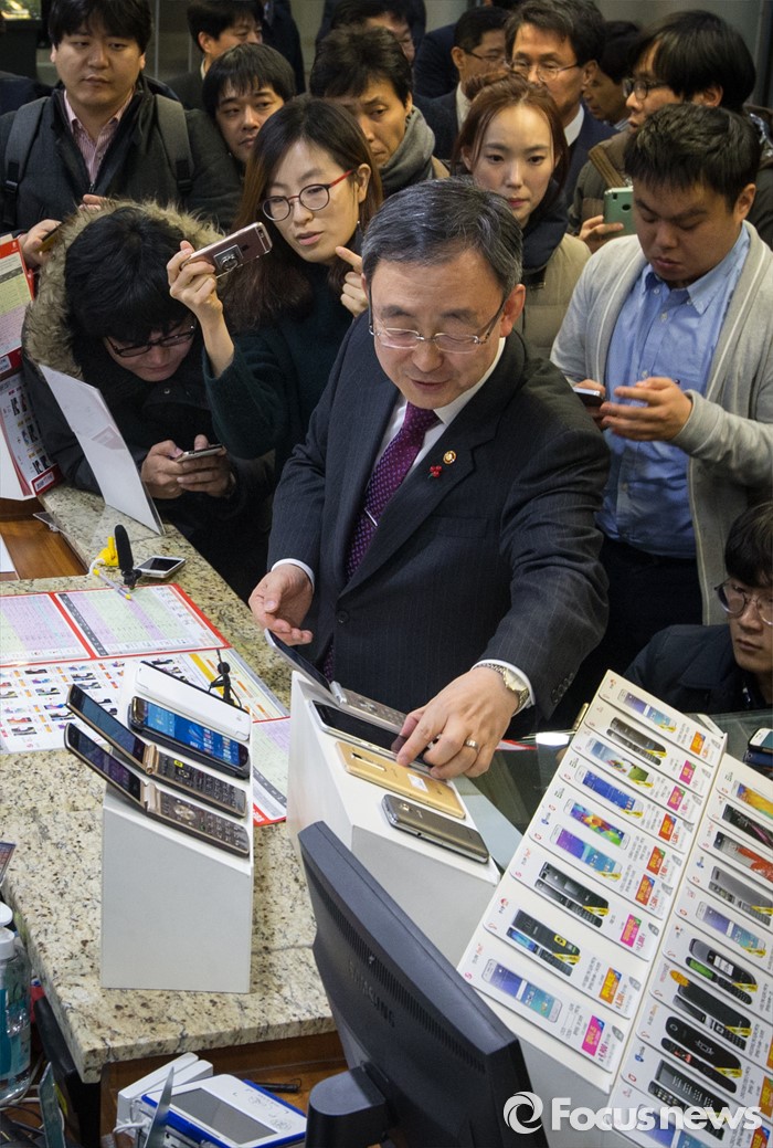 (서울=포커스뉴스) 13일 오후 서울 중구 중앙우체국 알뜰폰 판매창구를 찾은 최성준 방송통신위원장이 휴대폰을 살펴보고 있다.