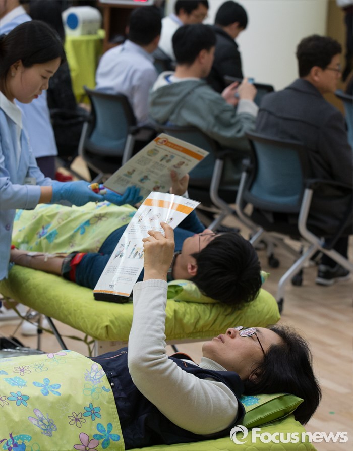 (세종=포커스뉴스) 13일 오후 세종시 정부세종청사 1동 대강당에서 열린 '국무총리실과 함께하는 사랑의 헌혈' 에 국무총리실 직원들이 헌혈을 하고 있다.