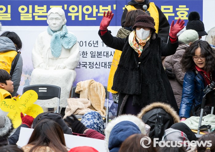(서울=포커스뉴스) 13일 오후 서울 종로구 옛 일본대사관 앞에서 열린 제1213차 정기수요집회에 참석한 일본군 위안부 피해자 할머니가 참가자들을 향해 인사하고 있다.