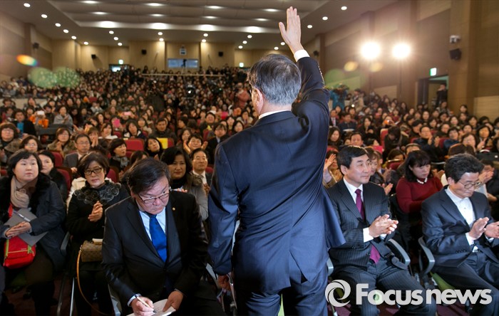 (서울=포커스뉴스) 13일 오후 서울 여의도 국회 의원회관에서 더불어민주당 누리과정특위 주최로 열린 임박한 보육대란, 어떻게 해결할 것인가 긴급 현안토론회에 참석한 문재인 대표가 참석자들을 향해 인사하고 있다.