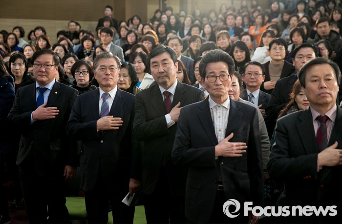(서울=포커스뉴스) 13일 오후 서울 여의도 국회 의원회관에서 더불어민주당 누리과정특위 주최로 열린 임박한 보육대란, 어떻게 해결할 것인가 긴급 현안토론회에 참석한 김태년(왼쪽부터) 누리과정특위 위원장, 문재인 대표, 이종걸 원내대표, 이목희 정책위의장, 도종환 의원이 국기에 대한 경례를 하고 있다.