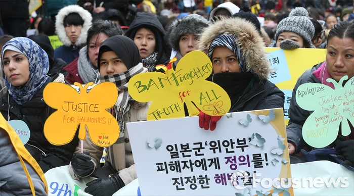 (서울=포커스뉴스) 13일 오후 서울 종로구 옛 일본대사관 앞에서 열린 제1213차 일본군 위안부 피해자 문제 해결 위한 정기 수요시위에서 참가자들이 일본정부의 공식 사과를 촉구 하고 있다.