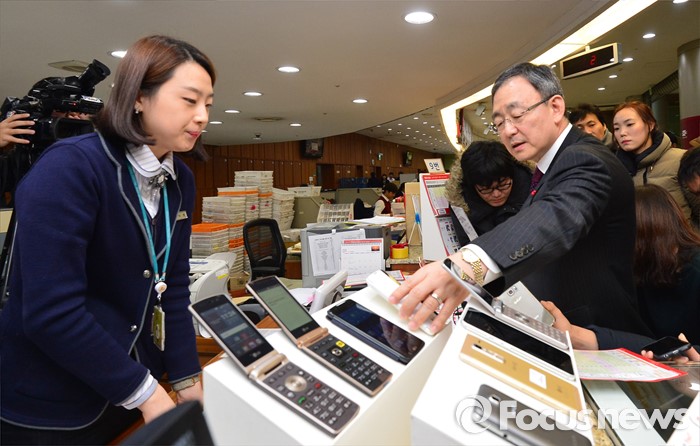 (서울=포커스뉴스) 13일 오후 서울 중구 중앙우체국 알뜰폰 판매창구를 찾은 최성준 방송통신위원장이 휴대폰을 살펴보고 있다.