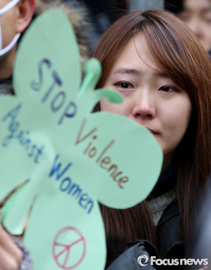 (서울=포커스뉴스) 13일 오후 서울 종로구 옛 일본대사관 앞에서 열린 제1213차 일본군 위안부 피해자 문제 해결 위한 정기 수요시위에서 한 참가자가 눈물을 흘리고 있다.