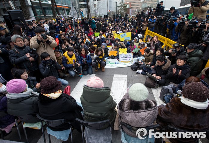 (서울=포커스뉴스) 13일 오후 서울 종로구 옛 일본대사관 앞에서 열린 제1213차 정기수요집회 앞서 열린 한일 일본군 위안부 합의 무효 기자회견에서 일본군 위안부 피해자 할머니들이 앉아 있다.
