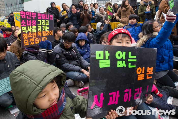 (서울=포커스뉴스) 13일 오후 서울 종로구 옛 일본대사관 앞에서 열린 제1213차 정기수요집회에 참석한 어린이들이 일본의 공식 사과와 법적 책임을 요구하는 구호를 외치고 있다.
