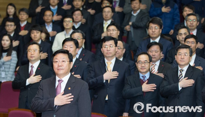 (세종=포커스뉴스) 주형환 신임 산업통상자원부장관이 13일 오후 세종시 정부세종청사 산업부 대강당에서 열린 취임식에 참석해 국기에 대한 경례를 하고 있다.