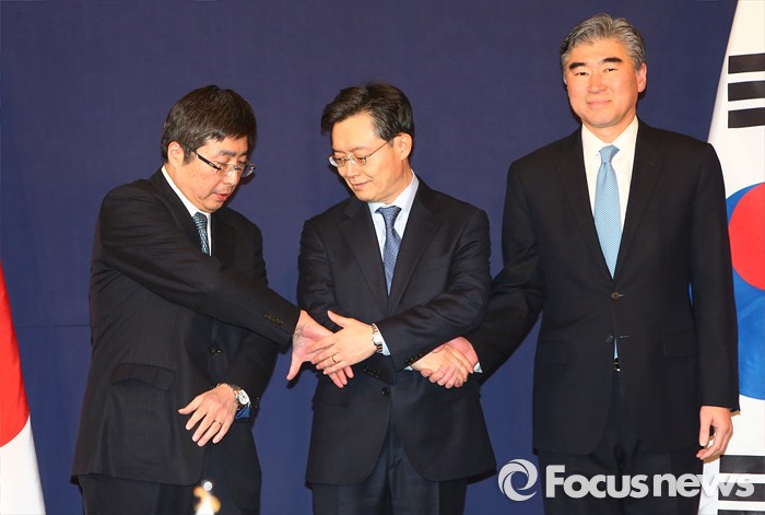 (서울=포커스뉴스) 한미일 6자회담 수석대표가 4차 핵실험을 감행한 북한에 대한 강력하고 실효적인 제재 방안 논의를 위해 13일 오후 서울 소공동 롯데호텔에서 만나 악수하고 있다. 왼쪽부터 이시카네 기미히로(石兼公博) 일본 아시아대양주국장, 황준국 외교부 한반도평화교섭본부장, 성 김 미 국무부 대북정책특별대표.