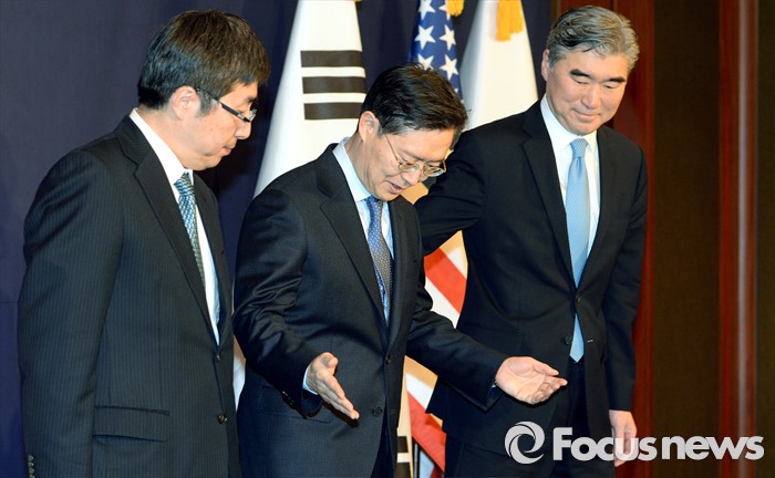 (서울=포커스뉴스) 한미일 6자회담 수석대표가 4차 핵실험을 감행한 북한에 대한 강력하고 실효적인 제재 방안 논의를 위해 13일 오후 서울 소공동 롯데호텔에서 만나 악수한 뒤 자리로 향하고 있다. 왼쪽부터 이시카네 기미히로(石兼公博) 일본 아시아대양주국장, 황준국 외교부 한반도평화교섭본부장, 성 김 미 국무부 대북정책특별대표.