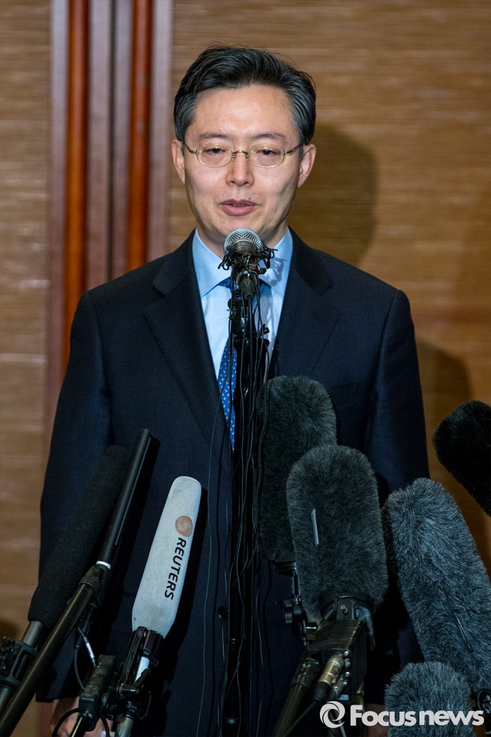 (서울=포커스뉴스) 황준국 외교부 한반도평화교섭본부장이 13일 오후 서울 중구 롯데호텔에서 열린 '한미일 6자회담 수석대표 긴급회동'에 자리해 북한 4차 핵실험 강행 관련 대북제재 방안 논의를 마친 뒤 입장발표를 하고 있다.