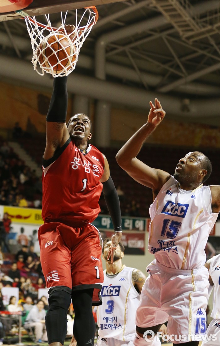 (안양=포커스뉴스) 13일 안양실내체육관에서 열린 2015-2016 프로농구 KGC-KCC 경기에서 KGC 찰스 로드가 KCC 허버트 힐의 수비를 뿌리치며 원핸드 덩크슛을 성공시키고 있다.