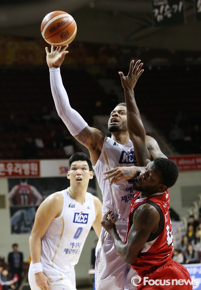 (안양=포커스뉴스) 13일 안양실내체육관에서 열린 2015-2016 프로농구 KGC-KCC 경기에서 KCC 안드레 에밋이 KGC 마리오 리틀의 수비를 제치며 원핸드슛을 시도하고 있다.