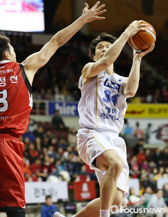 (안양=포커스뉴스) 13일 안양실내체육관에서 열린 2015-2016 프로농구 KGC-KCC 경기에서 KCC 김효범이 KCC 이정현의 수비를 피해 레이업슛을 시도하고 있다.