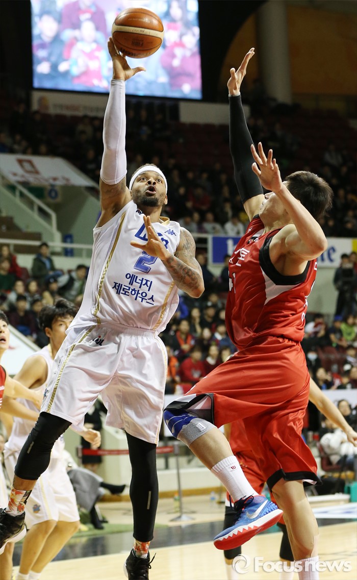 (안양=포커스뉴스) 13일 안양실내체육관에서 열린 2015-2016 프로농구 KGC-KCC 경기에서 KCC 안드레 에밋이 KGC 오세근의 수비를 제치며 원핸드슛을 시도하고 있다.
