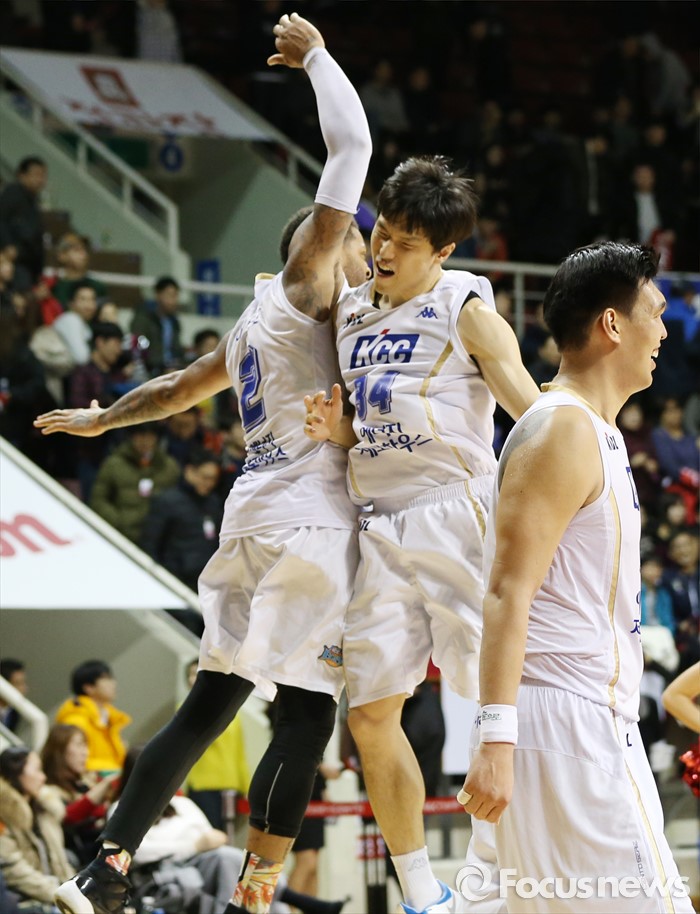 (안양=포커스뉴스) 13일 안양실내체육관에서 열린 2015-2016 프로농구 KGC-KCC 경기에서 경기 막판에 역전승한 KCC 안드레 에밋과 김효범이 뛰어 오르며 몸을 부딪치고 있다.