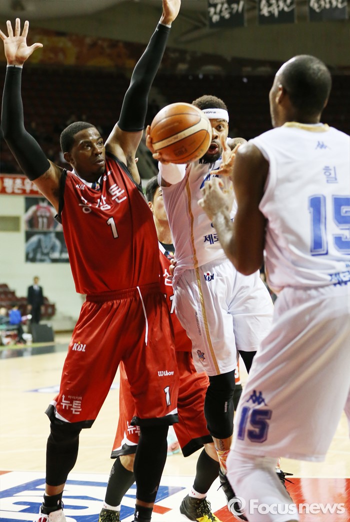 (안양=포커스뉴스) 13일 안양실내체육관에서 열린 2015-2016 프로농구 KGC-KCC 경기에서 KGC 찰스 로드의 수비에 막힌 KCC 안드레 에밋이 허버트 힐에게 패스하고 있다.