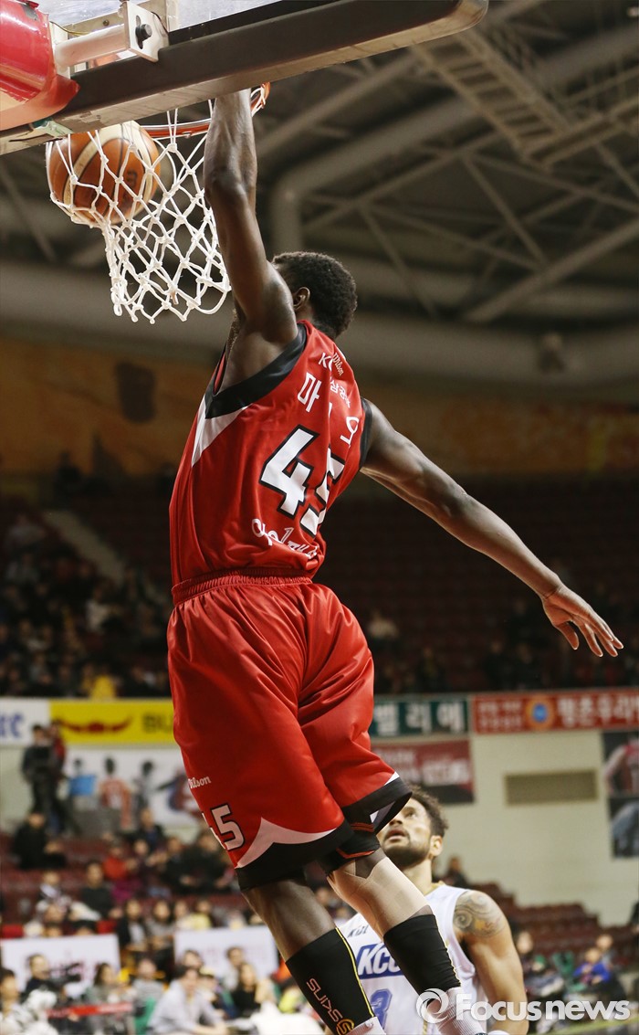 (안양=포커스뉴스) 13일 안양실내체육관에서 열린 2015-2016 프로농구 KGC-KCC 경기에서 KGC 마리오 리틀이 원핸드 덩크슛을 림안에 꽂아 넣고 있다.
