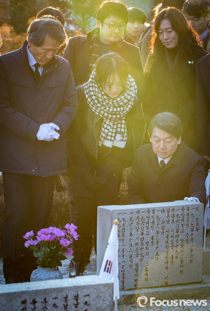 (서울=포커스뉴스) 14일 오전 서울 강북구 국립 4.19 민주묘지를 찾은 한상진 국민의당 창당준비위원장과 안철수 인재영입위원장이 순국선열의 묘비를 어루만지고 있다.