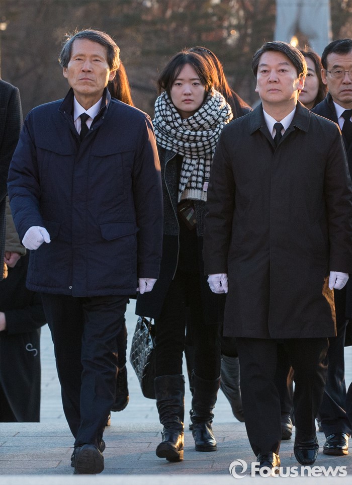 (서울=포커스뉴스) 14일 오전 서울 강북구 국립 4.19 민주묘지를 찾은 한상진(왼쪽 부터) 국민의당 창당준비위원장과 안철수 인재영입위원장이 분향단으로 발걸음을 옮기고 있다.